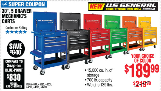 Harbor Freight Coupons - Harbor Freight Coupons Harbor Freight Coupons Updated: Friday 8/26/2022. U.S. GENERAL Series 2 30 In. 5 Drawer Mechanic's Cart for $229.99. ... At Harbor Freight Tools, the "Compare to" price means that the specified comparison, which is an item with the same or similar function, was advertised for sale at or above the "Compare to" price by another additional ...